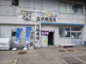 氷見漁港の中の市場の建物にお店の入口が見える。「氷見 魚市場食堂」そのまんまの光景が目にとまる☆彡